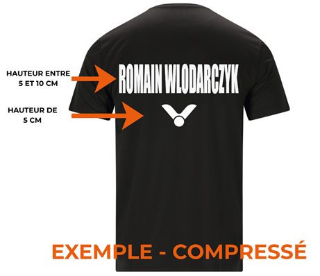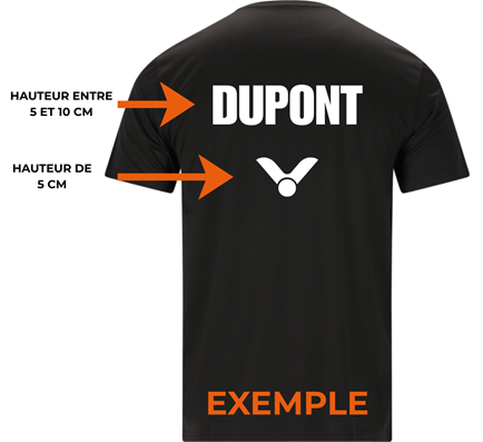 Concernant la personnalisation textile, ELYNOR SPORT s’engage à respecter le règlement imposé par la FFBaD. Ainsi, le nom du joueur sera compris entre 5 et 10 cm de hauteur. Le logo de la marque sera lui de 5 cm. De plus, ELYNOR SPORT se réserve le droit de compresser (en longueur) le nom du joueur pour des raisons techniques.